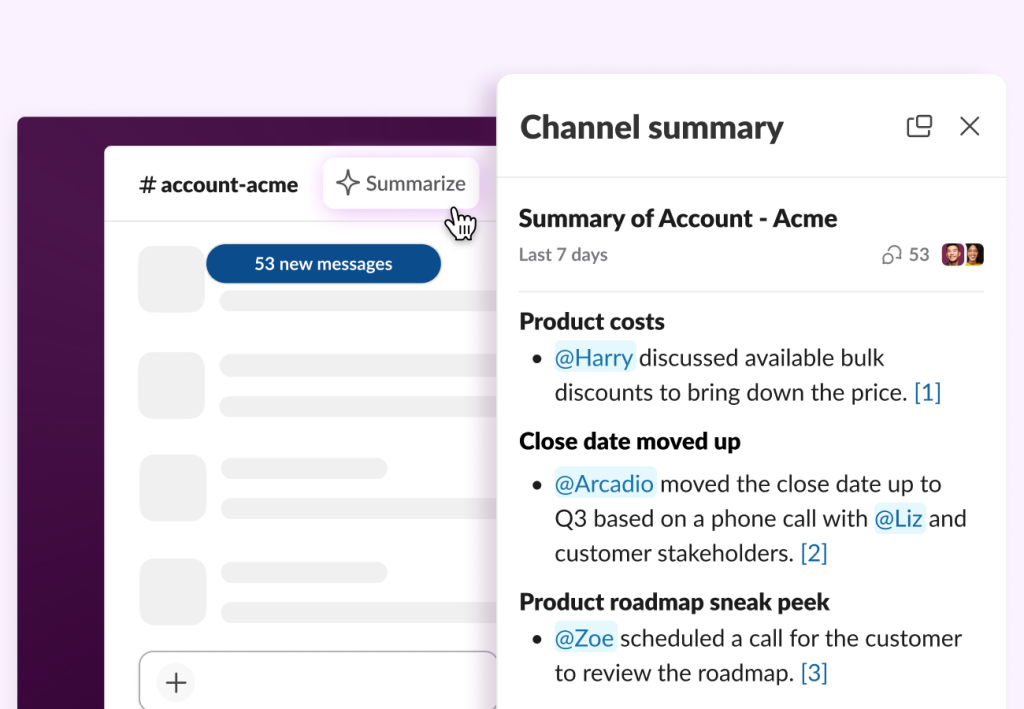When channels, threads, or direct messages overflow with meeting notes, it can be difficult to sift through and find the key takeaways. Slack AI summarizes messages in seconds, allowing you to catch up instantly and effortlessly.